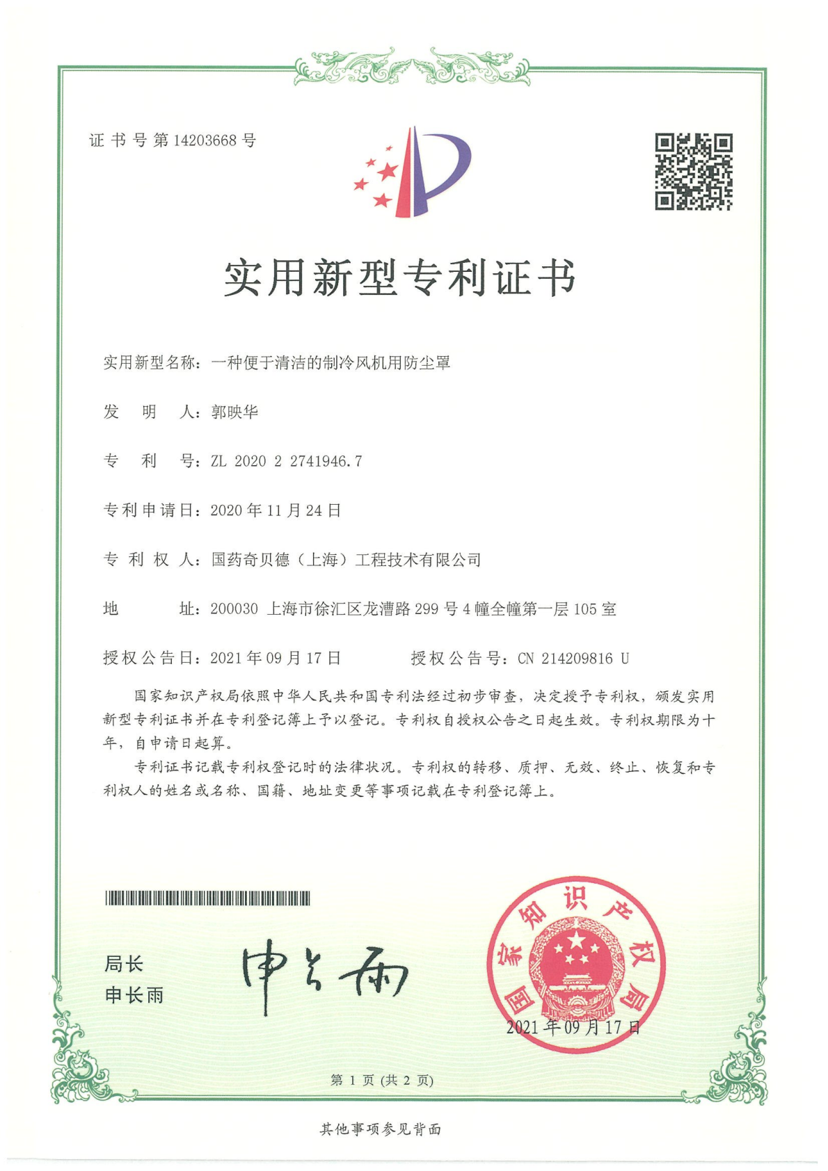 实用新型专利证书