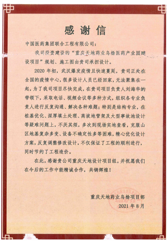 让客户满意,为客户创造价值,引领行业发展,是国药工程的使命,更是国药工程的不懈追求。客户的表扬是对国药工程的认可与信任,更是对国药工程综合技术服务实力的充分肯定。未来,国药工程将继续发挥以设计为核心的医药工程全过程技术服务优势,持续提升价值创造能力,携手合作伙伴共赢发展。